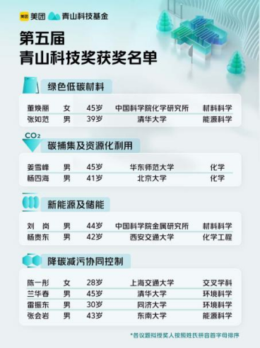 “青山科技奖”由美团于2021年发起设立,旨在鼓励更多科研力量投身环保研究,助力绿色、低碳、可持续发展基础科研及技术成果转化。至此,累计已有49名青年科学家获奖。