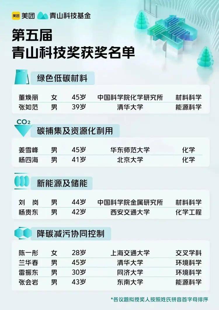 1月29日,由美团出资的第五届青山科技奖获奖名单正式揭晓,10位绿色低碳领域的青年科学家入选,每人将获得税后100万元奖金,且可以自由支配。